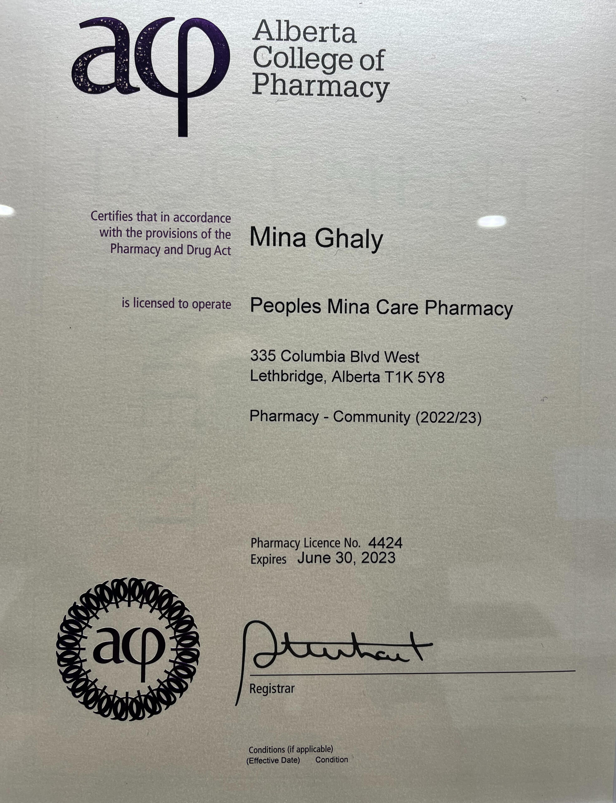the licensee.If you are still concerned, you may contact the Alberta College of Pharmacy toll free at 1-877-227-3838 or by visiting the college website abpharmacy.ca
